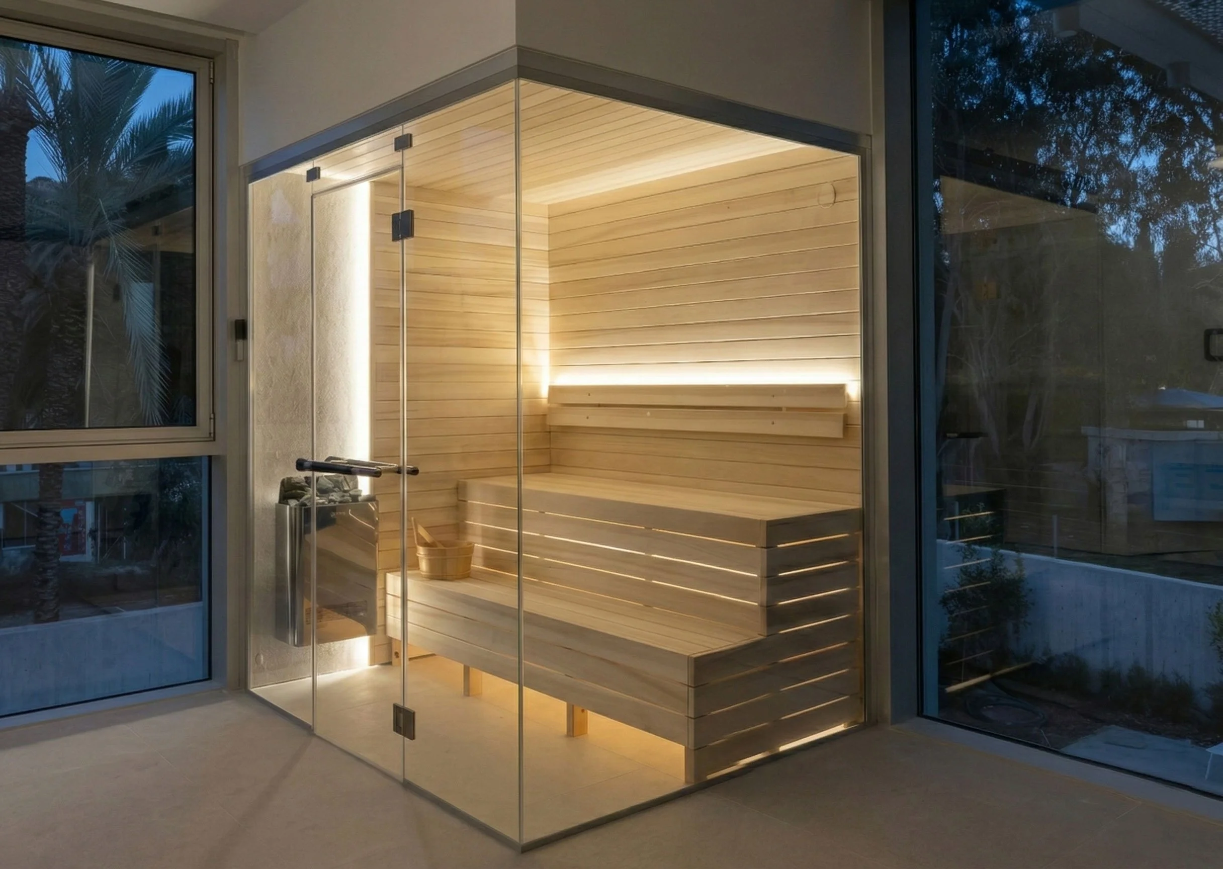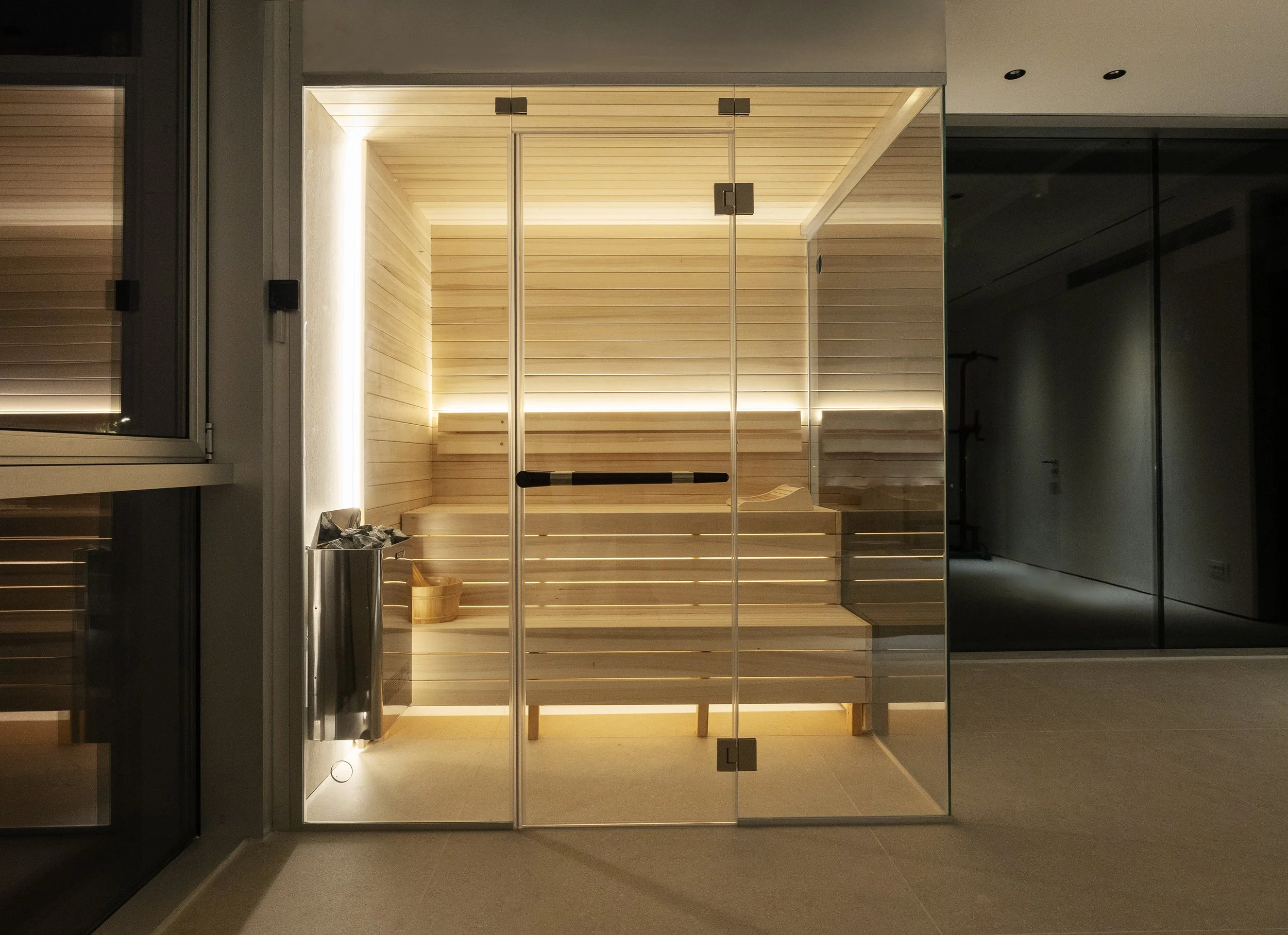 Integrated through hidden architectural lighting, the design creates a captivating glow and an inviting atmosphere. This subtle illumination highlights the material textures, transforming the sauna into a warm, serene retreat.