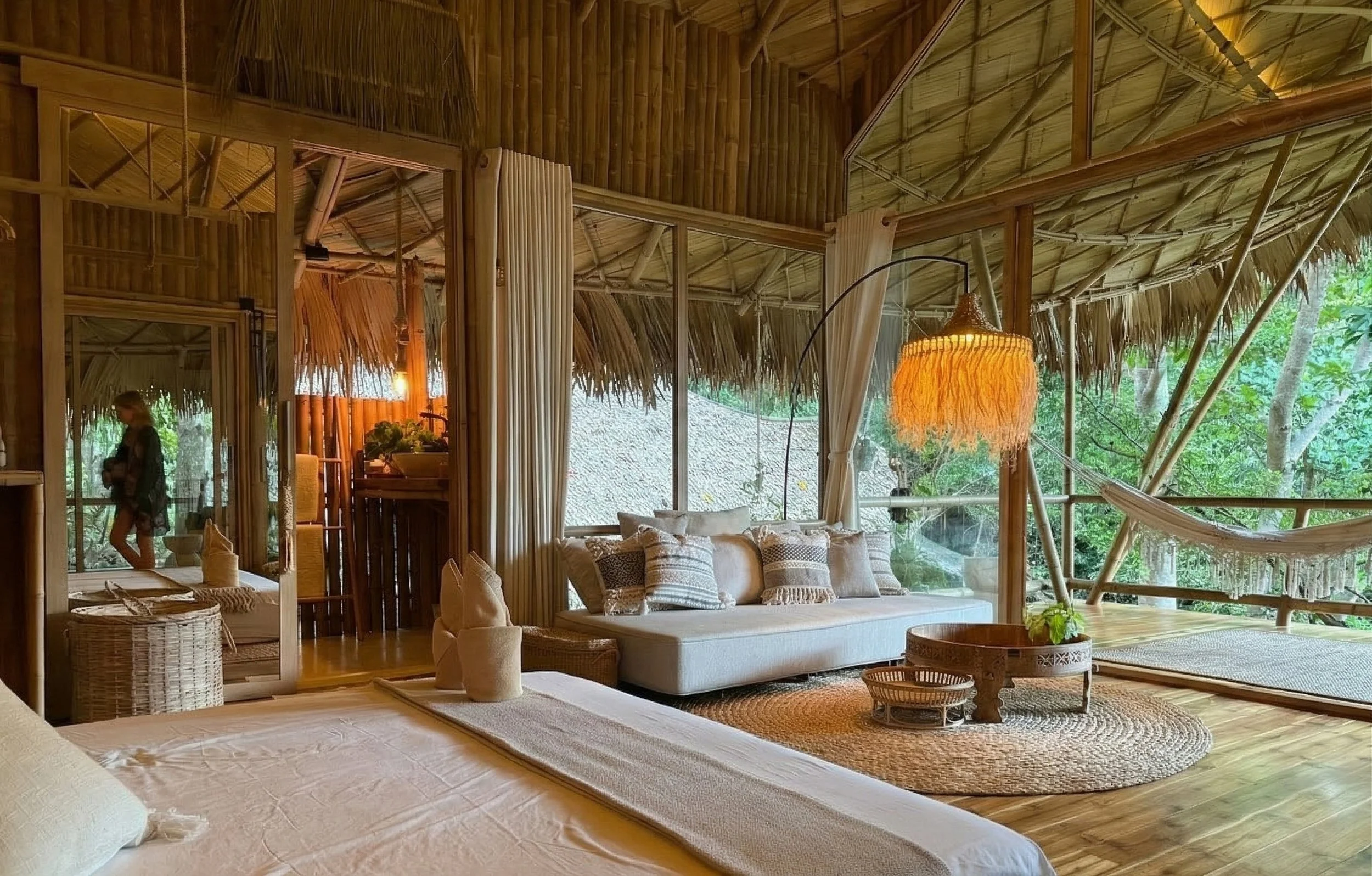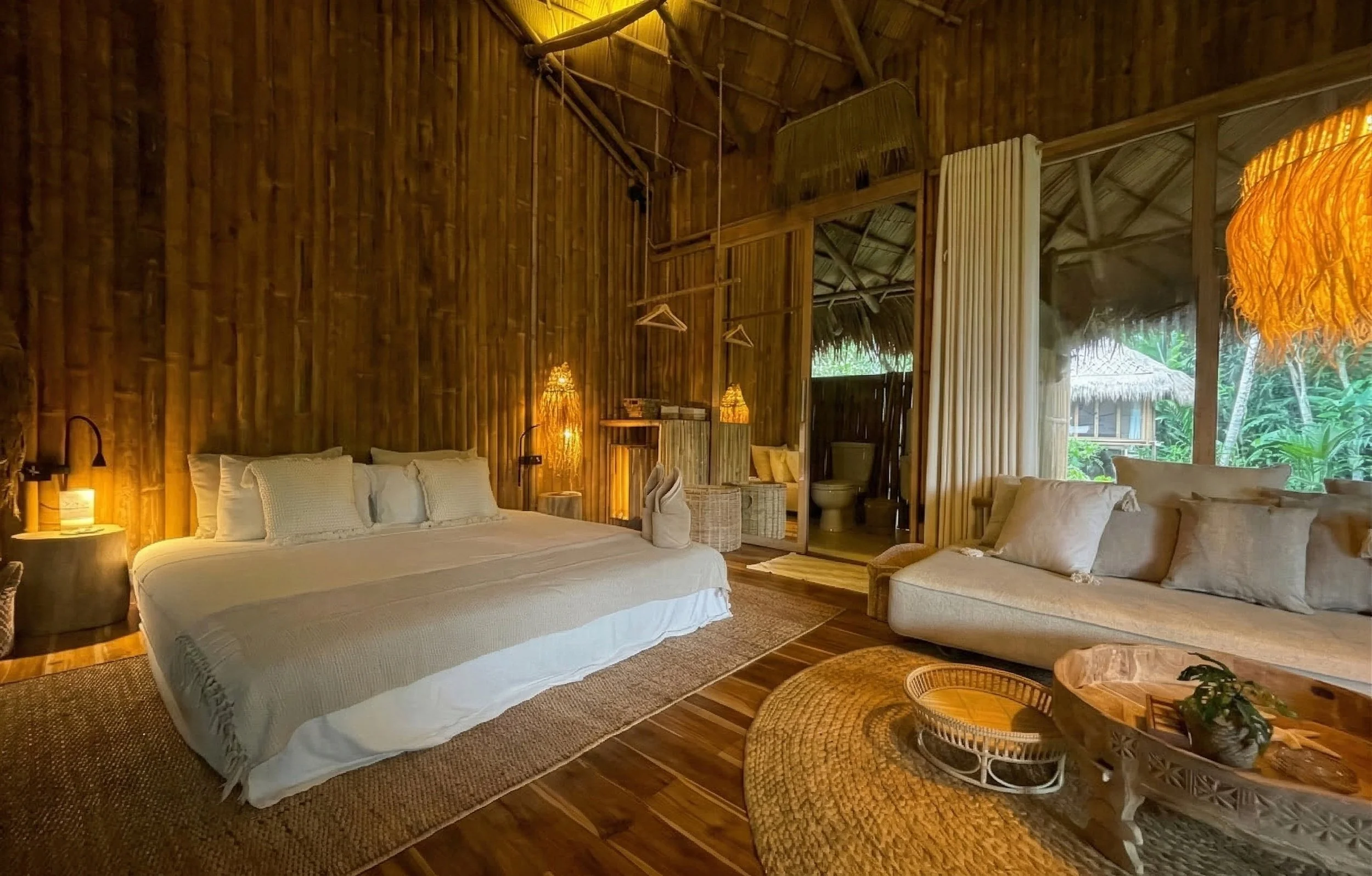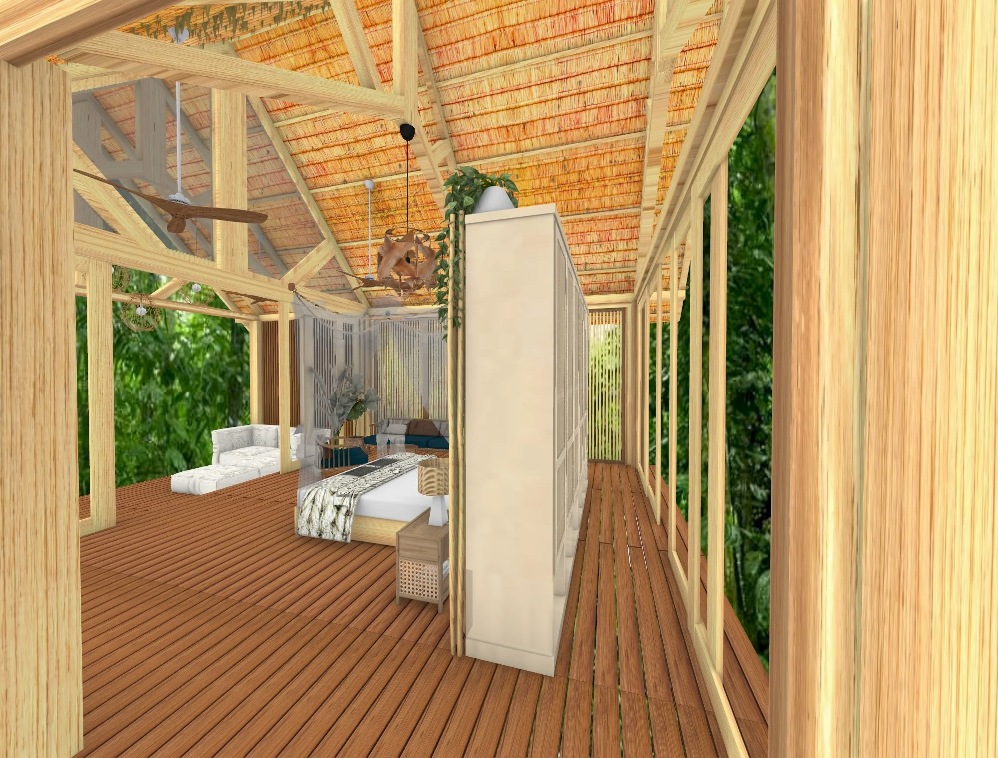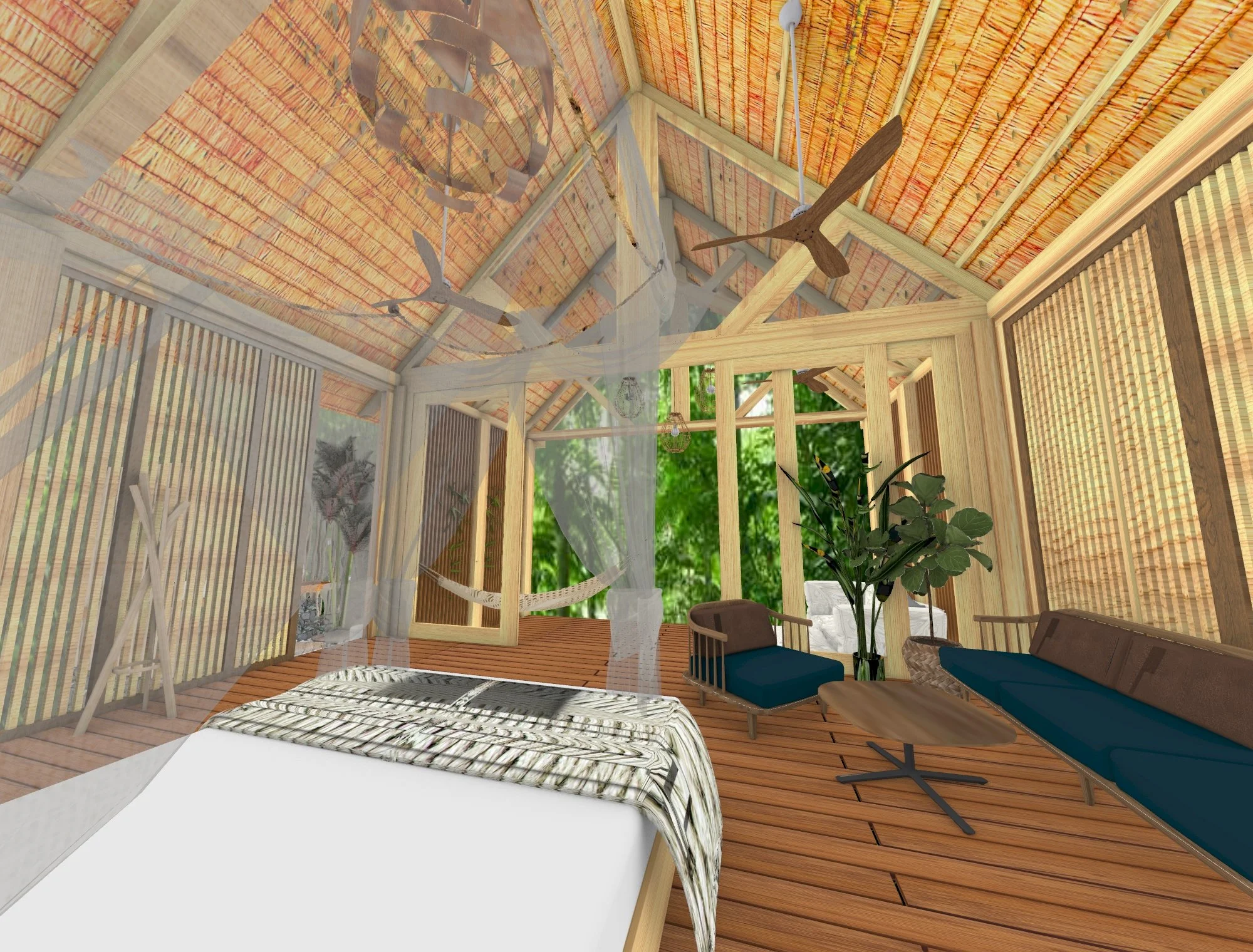The concept focused on dissolving the boundary between interior and exterior space. enhancing the connection to nature. Large terraces, outdoor showers, and expansive window openings create an immersive experience of sleeping inside feeling fully surrounded by the jungle.