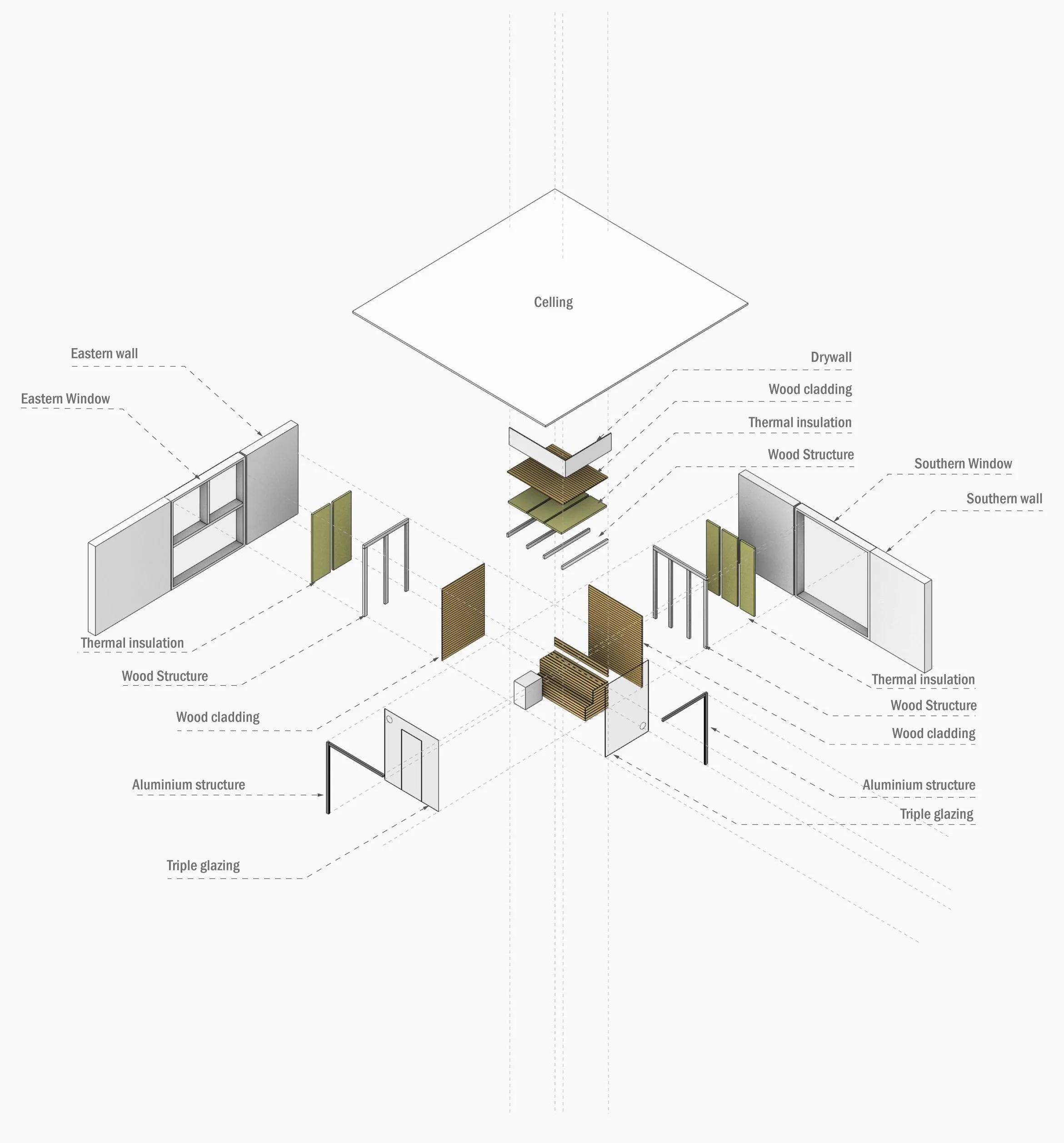 An exploded diagram of the sauna presents the main components of the structure and shows how they are assembled.