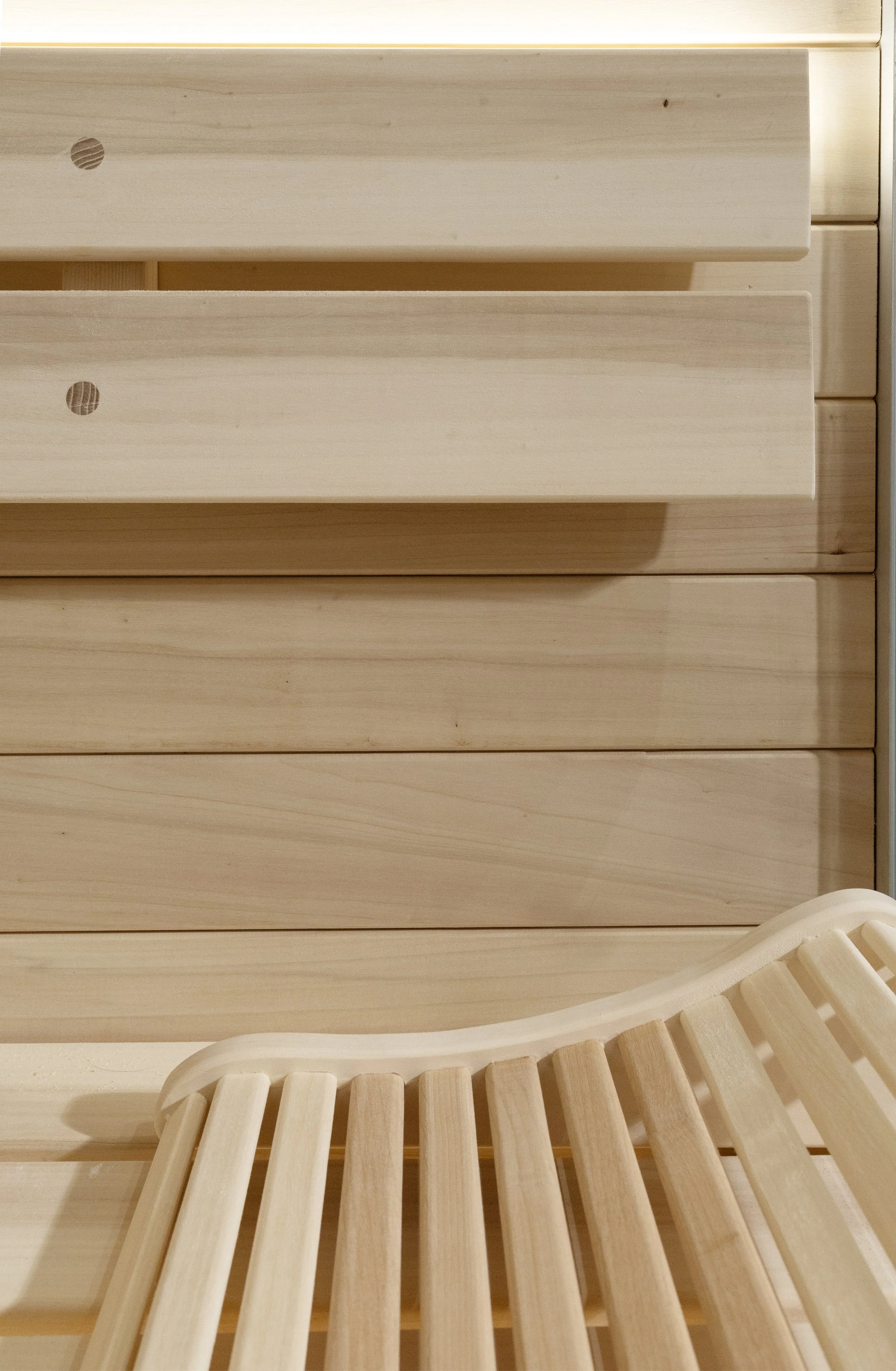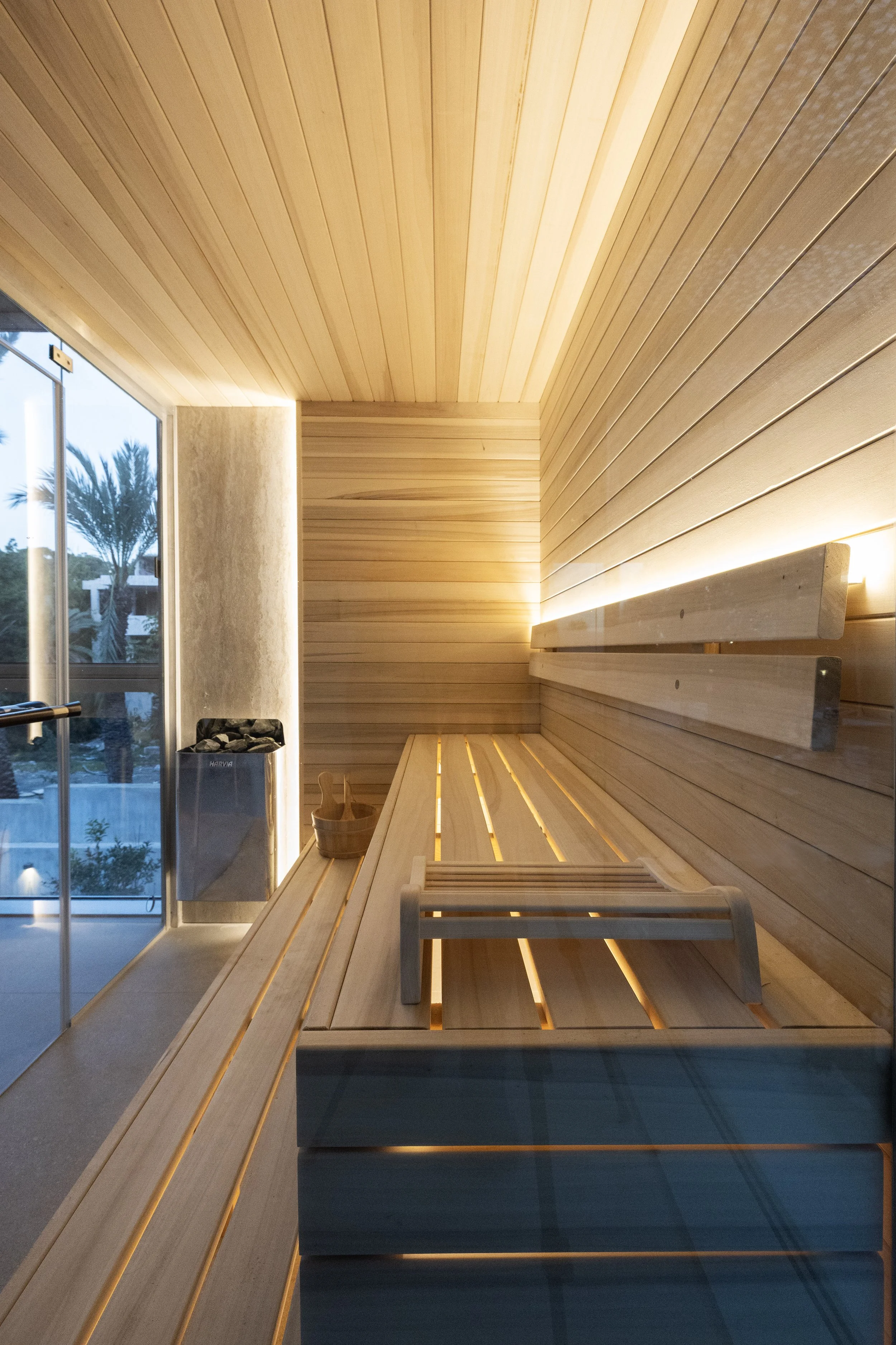 Integrated through hidden architectural lighting, the design creates a captivating glow and an inviting atmosphere. This subtle illumination highlights the material textures, transforming the sauna into a warm, serene retreat.