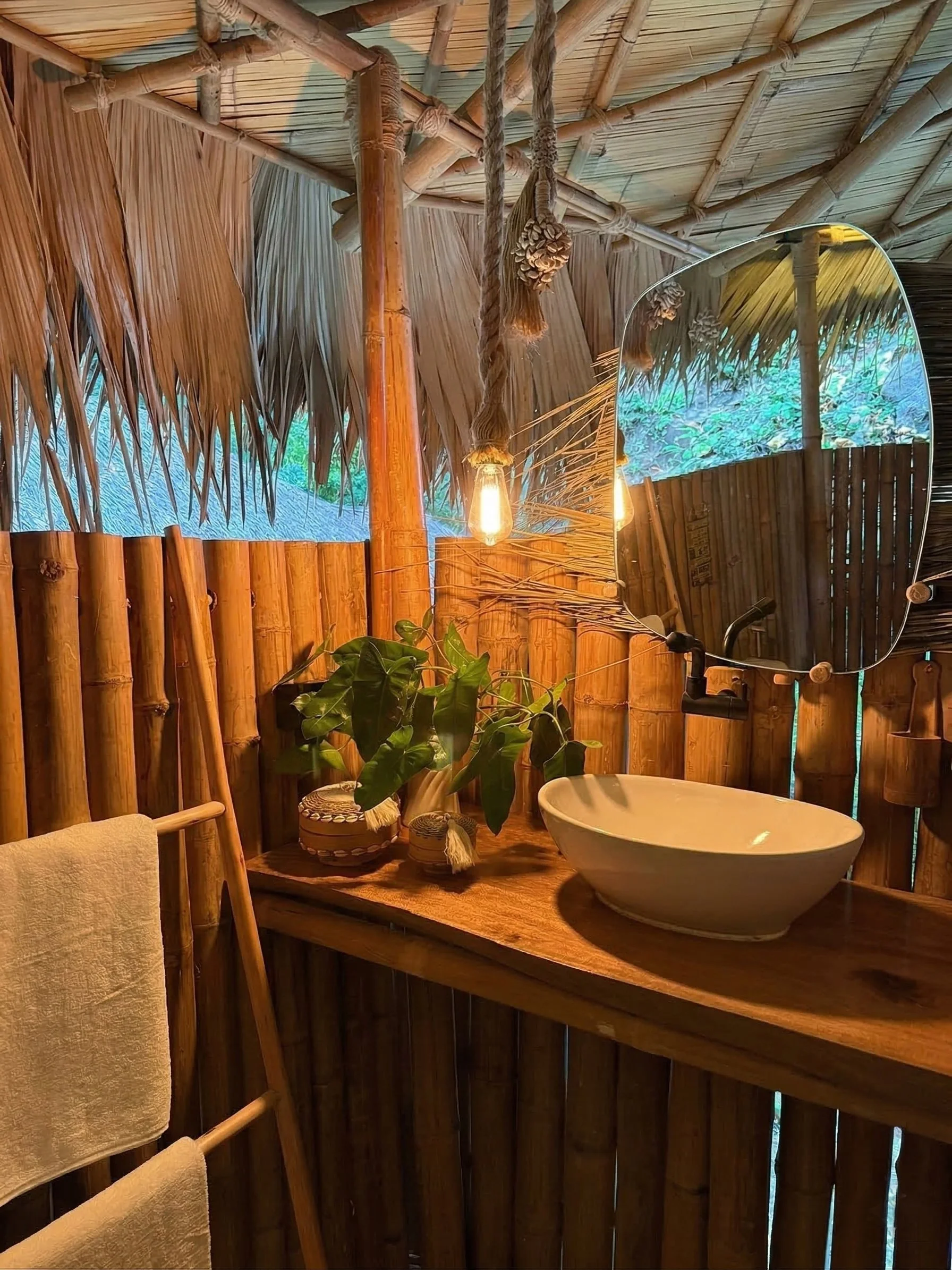 The open outdoor shower that gives you the sensation of showering in the heart of the jungle, seamlessly blending lush greenery with the interior space.